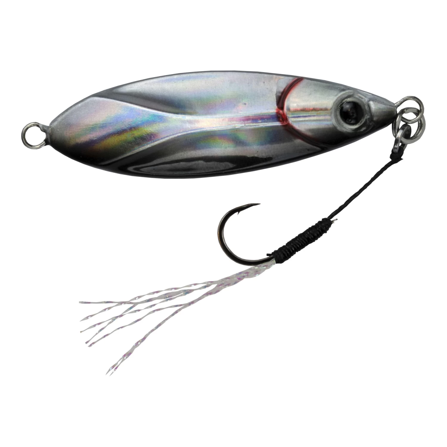 A shore slow jig that when looking down from the top at the lure has an uneven build and weight distribution. One side of the jig is completely flat while the other side is fatter. The weight has not only been distributed to the one side of the jig, it has a bias towards the back of the lure. This two pronged uneven weight distribution design produces an erratic but slow action that predatory fish find irresistible. It comes in five different, reflective colours and has a UV blast finish too, this makes it react well to light for maximum attraction. An excellent lure for targeting bass, pollack, coalfish, wrasse and other predatory species. It comes fitted with a HTO Shore Assist Jig with lure flash attractor and equipped with quality stainless steel split rings.
