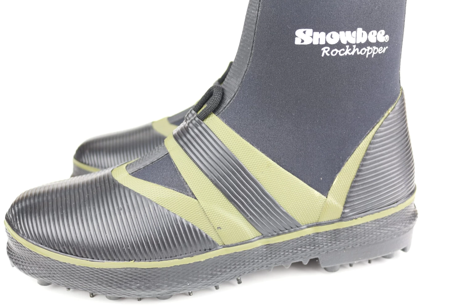 Snowbee Rockhopper Wading Boots, originated in Japan for Rock fishing, where good grip is essential – hence the name Rockhopper. Fitted with Snowbee unique Spike Sole, these boots offer the ultimate grip on any surface – particularly weed covered rocks, where other soles fail. The flexible, hardened steel spikes cut down through the weed, to grip the rock below and will even grip in icy conditions. The Snowbee Rockhopper Wading Boots have Neoprene uppers with a side zip closure, they are equally suitable for ‘wet wading’ in the summer months or overseas.