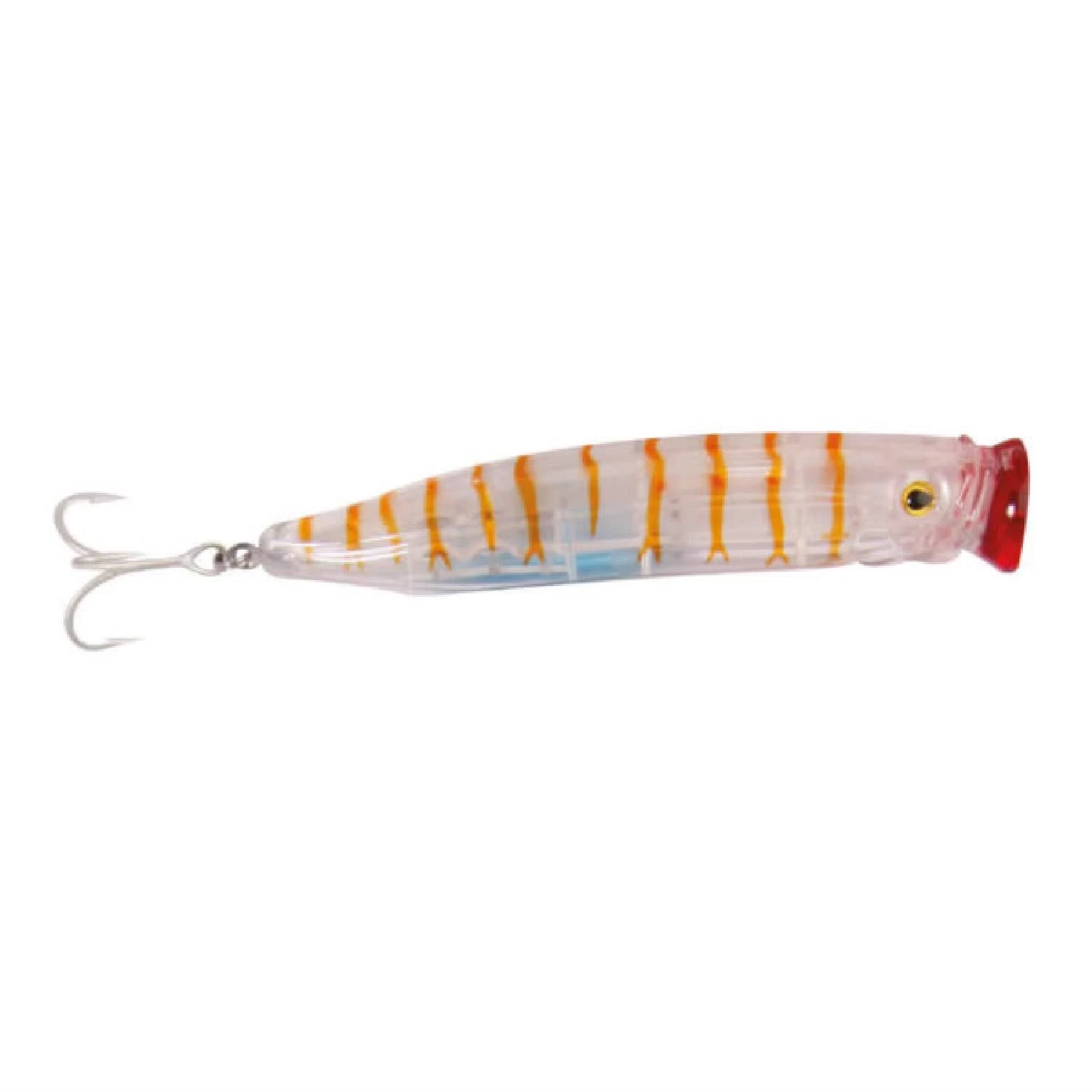 Heavy Popper with a great launching capacity, even in adverse conditions. During normal and slow retrievals, it displaces a large amount of water and is perfect during pauses, with the stern sunk down. For rapid retrievals, it is submerged just below the surface, making it perfect for calm, sunny days when fish pursue surface lures without attacking them.